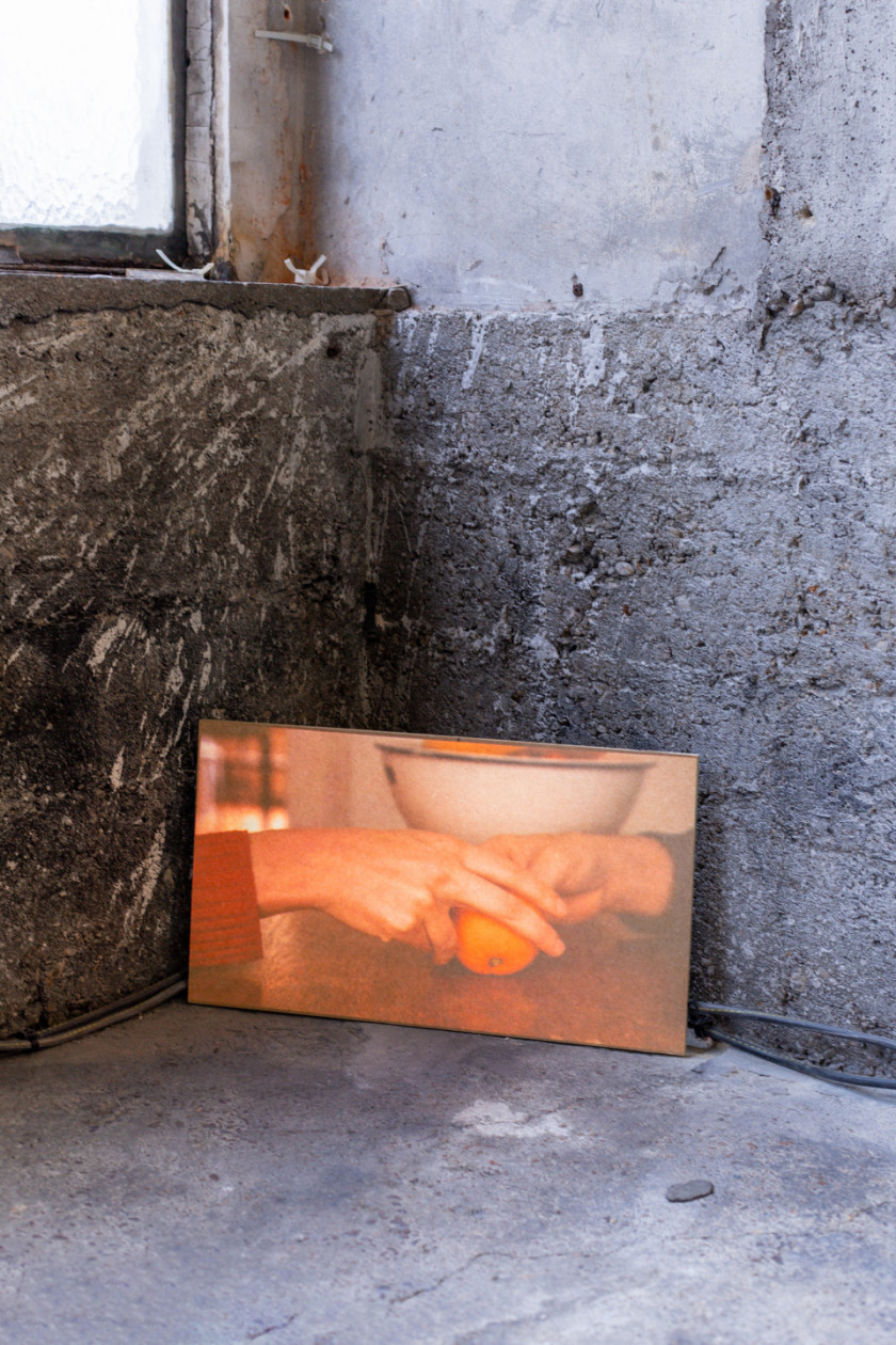 At OFFSCREEN, Alex Reynolds presents “Peel” (2022), a video installation.Two hands belonging to different bodies negotiate their movements in the almost erotic act of peeling an orange. In a fixed shot that refers to the conventions of baroque still life, this eminently tactile footage captures the conversation between the fingers and the pulpy body they peel. Reynolds’ artistic practice revolves around a constant exploration of our modes of relating and affection through multiple registers and formats, especially in the way as these are manifested through the language of film.