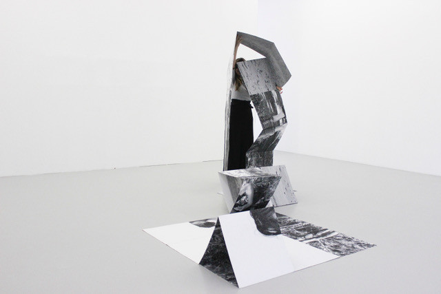 In her artistic practice, Arina Essipowitsch explores notions of identity and displacement determined by her biography. The artist reappropriates photography through a particular visual language: she enlarges, folds and transforms the image, breaking it down into several modules that are stretched out in space to build veritable three-dimensional objects. These fragments of a single piece combine to form an infinite number of new images, extending the viewer’s visual experience. These portable images stem from the artist’s sensitive relationship with the territories she travels through, and become traces of her own history, like a family album. During her performances, Arina literally plunges us into the moving photographic material, having fun blurring all reference points of scale and space to encourage us to break the boundaries of the image and look differently.