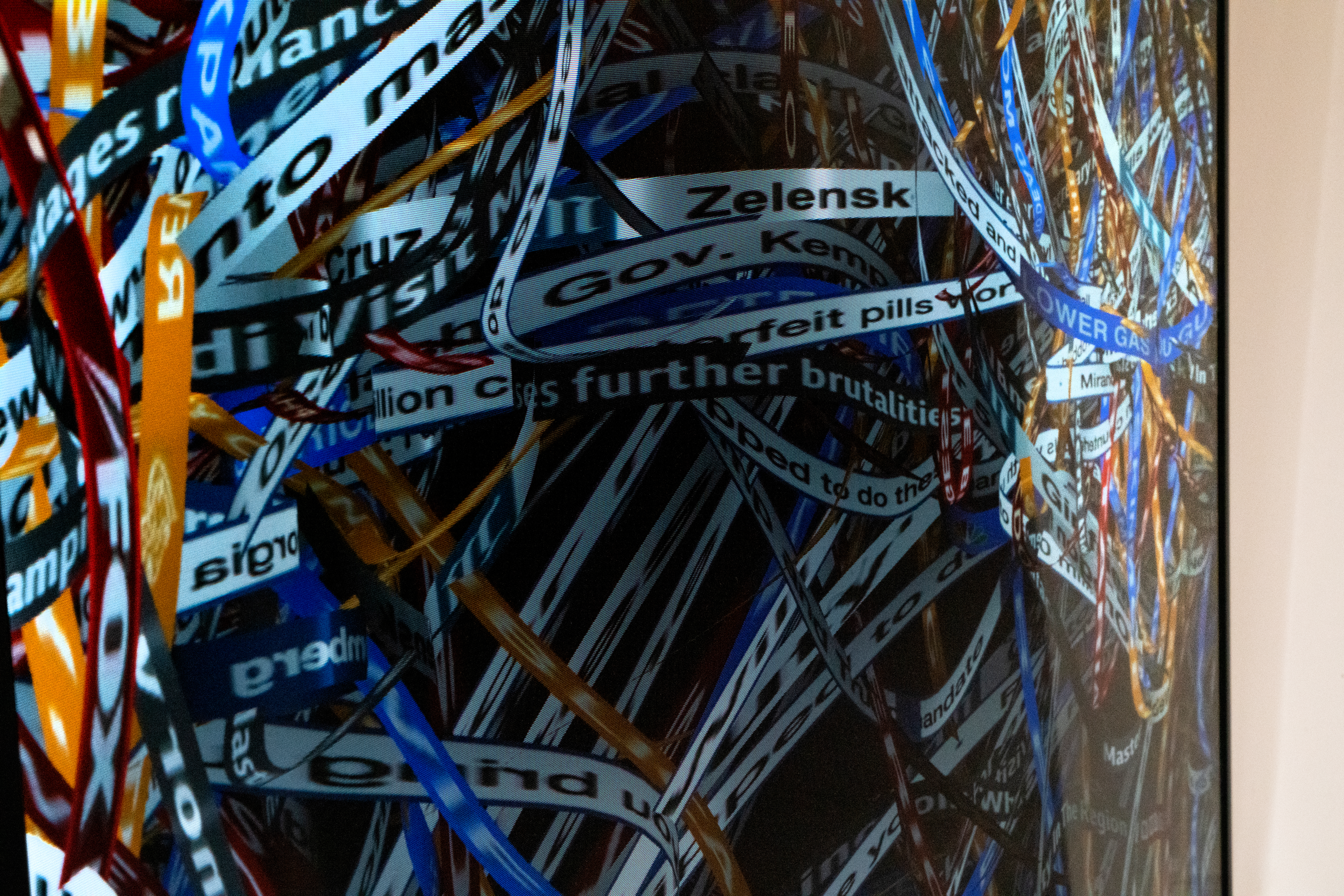 “Chyron” overlays international news chyrons, creating a chaotic fabric representing the ecosystem of conflicting information. Daniel Canogar’s series “Surge” explores how the world of data negotiates its relation- ship with the physical world. The project emerges from the artist’s preoccupation with the intangible – and invisible - nature of one of the main driving forces of our economy and society: the data-sphere. This “crisis of visibility” makes it very difficult for most of the population to comprehend how big data is impacting their lives. To materialize the world of data is an attempt to help us cognitively incorporate this new reality.