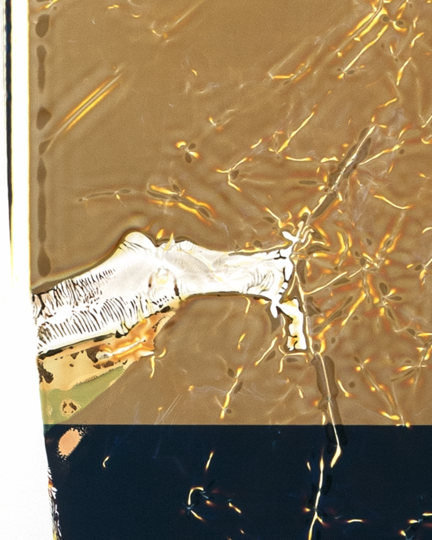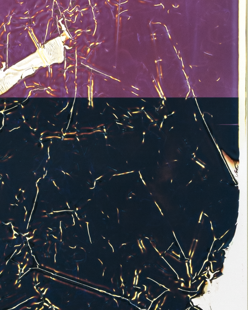To the question “What is a 21st century photograph?”, Carey answers by partnering the 19th century photogram with 20th century Polaroid’s instant technology. “What do these two have in common?” Her answer: the negative! Crush & Pull thus combines Polaroid and photogram using the Polaroid negative to create new abstract forms and blended hues with experimental approaches and innovative process-driven methods located in chemistry-laden Polaroid “pods” and the “light-tight” color darkroom.