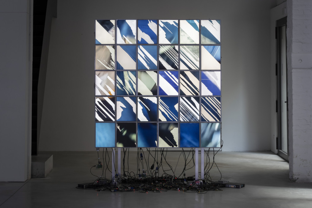 In the Videosculpture presented at OFFSCREEN, the polarizing filters of the screens have been partially removed, manually deconstructed into fleeting strips. Here, the DIY nature and punkish poetic gesture of taking a knife to the screen remains visible. On close inspection, this techno altarpiece reveals the dust and dirt as the glue of the machine is cut apart. Van der Auwera hence creates a distance from the event, flattening it through abstraction. This distance allows one to rethink and shift perception, escaping the problem that exists through ubiquitous exposure.