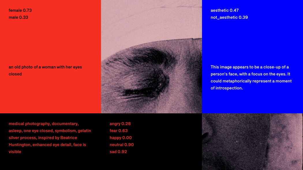 Ekphrasis is a video installation (6 min.) in which the collective continues a line of research exploring the new algorithmic connections between words and images established by computer vision models. In Ekphrasis, fragments from various films such as Agnès Varda’s Documenteur (1981), Jacques Tourneur’s Cat People (1942) and others are subjected to a complex and multi-layered algorithmic description process: objects, faces and emotions are detected and classified by object recognition systems, while image-to-text models are used to generate detailed descriptions. The piece draws attention to the processes of data mining in the digital world and to the poetic potential inherent in the radical impossibility of translating images into words and words into images. Ekphrasis was produced for the exhibition The World Through AI (2025) at Jeu de Paume.