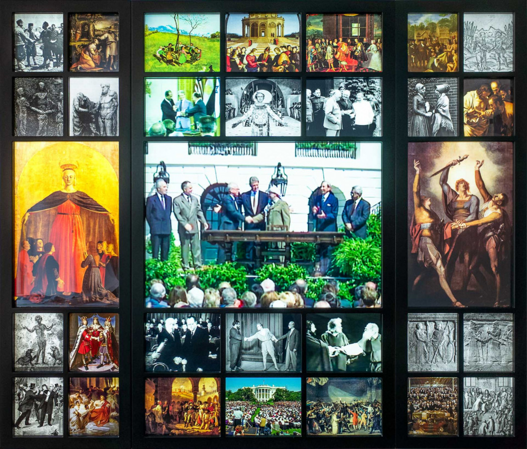 Jonas Englert’s work reflects social-philosophical phenomena and both political as well as historical narratives and materials through video, diagram, text, and sound. “Declaration of Principles” (2022) reflects the pictorial referentiality of the iconic scene performed by Yasser Arafat, Bill Clinton and Yitzhak Rabin in the course of the Declaration of Principles on Interim Self-Government Arrangements on September 13, 1993 in Washington, D.C. Using both moving and static found footage, the work recontextualizes this political staging in an altar-like polyptych, draws connections, both evident and obscured, and deconstructs the pictorial authenticity of the event. By interrogating the iconography and rhetoric that makes a scene historic, Declaration of Principles questions the singularity and originality not just of this specific scene, but of the image in general.