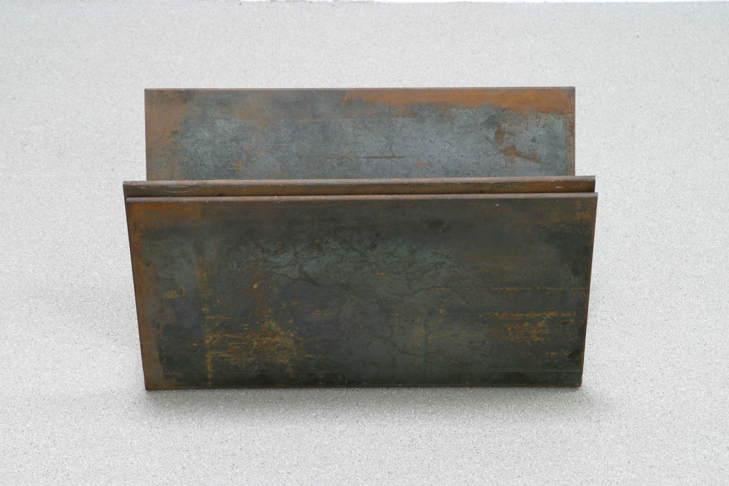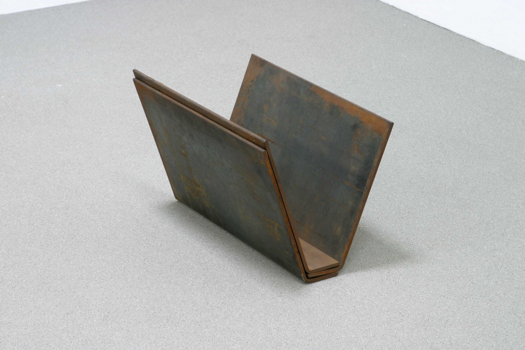 Three Angles Prop consists of three slightly bent forged steel plates stacked on top of each other in perfect balance but with a subtle difference in position and size. One of Serra’s first works with plates, like the other works in the artist’s Prop series, it shows the challenge of resolving the dilemma of how a work can, in apparent precarious balance, support itself by its own weight. The work was exhibited in the canonical exhibition Live In Your Head: When Attitudes Become Form curated by Harald Szeemann at Kunsthalle Bern in 1969.