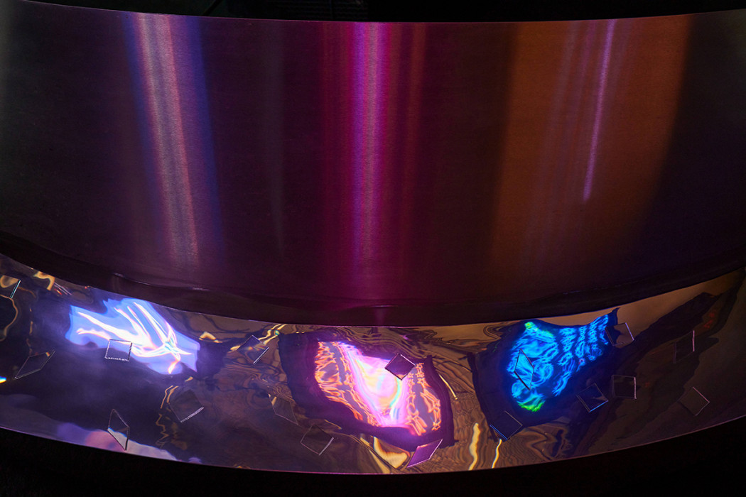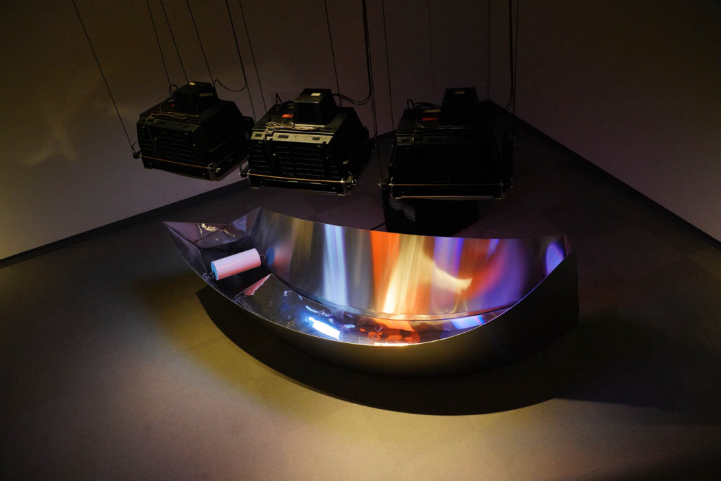 River (1979-81) is a video sculpture by Shigeko Kubota that suspends three CRT monitors above a stainless-steel basin, with the screens tilted downward just below the viewer’s line of sight. The three screens loop a single-channel video combining electronically synthesized hearts, stars, and abstract electronic feedback with colorized images of Kubota swimming in Wyoming’s Snake River, as well as excerpts from the artist’s iconic video Duchampiana: Nude Descending a Staircase, 1976. The basin, curved to resemble the meandering flow of a river, is filled with water and shards of mirrored glass that catch and scatter light. A small wave machine at its base sends gentle ripples across the surface, fracturing the reflected image, echoing the unpredictability and instability of flowing water.