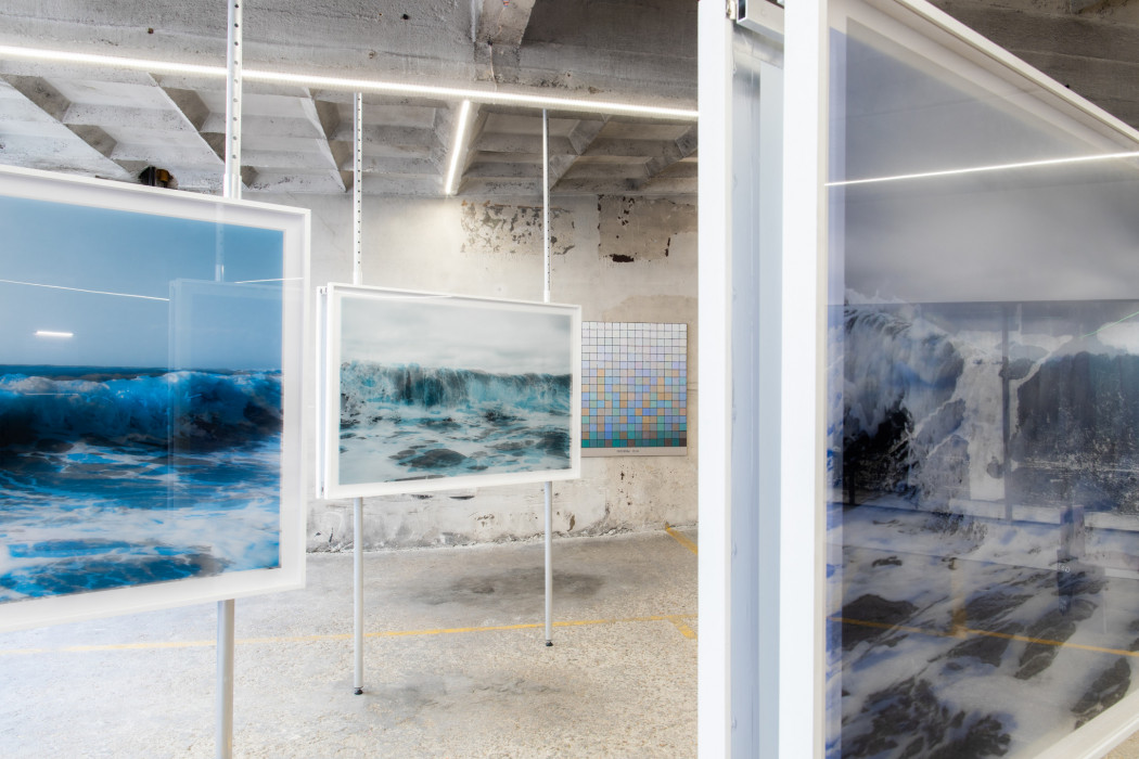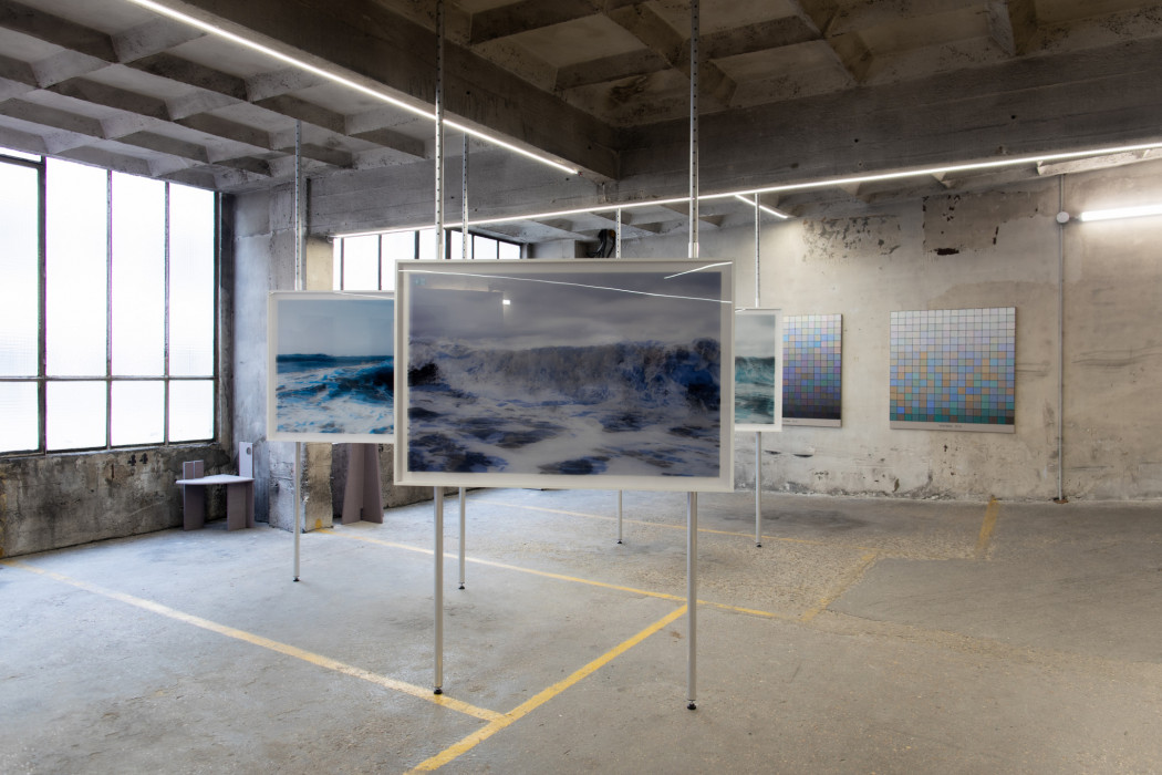 Each photograph of Stijn Cole’s “Blueprint” (2024) seascape series combines two images of the same wave, separated by a fraction of a second. The first image is printed in blue monochrome on the back of the frame and the second one, printed on the Plexiglass in black and white, floats a few centimeters in front of it. In this layered perception of the expressive nature of the waves, the viewer’s position determines the work through the small distance between the two images. For this installation, Cole photographed the sea on opposite sides of the Belgian and British coasts. The locations are shown back to back, referring to the physical relationship between the two points of view. On each coast, the artist also took a photograph which serves as the basis for two abstract paintings. These “Colorscapes” (2024) encapsulate lightness and darkness and represent the color palette of a moment deconstructed in 256 shades.