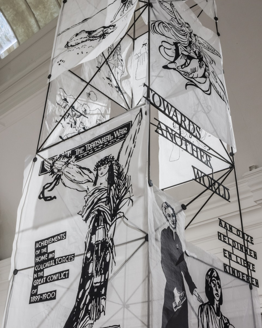 Towards Another World reimagines the obelisk shapes of two war monuments to the same war: the Anglo-Boer War memorial, in Plymouth, England and the Women’s Memorial in Bloemfontein, South Africa which honors the thousands of women and children who died in British concentration camps. These two memorials reveal two sides to the same war at the turn of the twentieth century. In Williamson’s work, the obelisk is a monument in flux: suspended in space, draped in delicate fabrics, and with scorched branches referencing the British “scorched earth” policy. Resin-cast chocolate boxes, recalling Queen Victoria’s 1900 gift to British soldiers, glow like embers, fragments that challenge fixed histories and reflect the enduring legacies of colonialism.