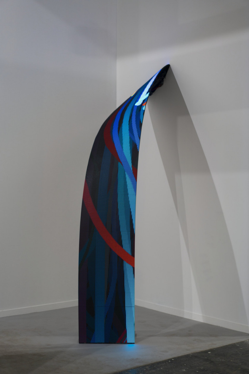 Les œuvres d’art sont des écrans LED en forme de ruban qui émergent du mur avec des gestes courbes et descendent ensuite jusqu’au sol. Les écrans deviennent des conduits de données liées aux informations météorologiques en temps réel de la ville de Paris, y compris la vitesse du vent, la température, la pression barométrique et l’humidité. Le flux d’informations est représenté par des particules qui laissent des traces derrière elles, créant des formes abstraites qui prennent le pouls des activités de la ville.