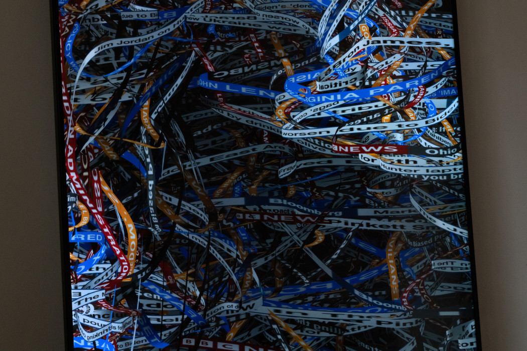 “Chyron” superpose des chyrons d’actualités de chaînes internationales, créant un tissu chaotique représentant l’écosystème d’informations contradictoires. La série “Surge” de Daniel Canogar explore la manière dont le monde des données négocie sa relation avec le monde physique. Le projet est né de la préoccupation de l’artiste pour la nature intangible - et invisible - de l’une des principales forces motrices de notre économie et de notre société : la sphère des données. Cette “crise de la visibilité” fait qu’il est très difficile pour la majorité de la population de comprendre l’impact du big data sur leur vie. Matérialiser le monde des données est une tentative pour nous aider à intégrer cognitivement cette nouvelle réalité.
