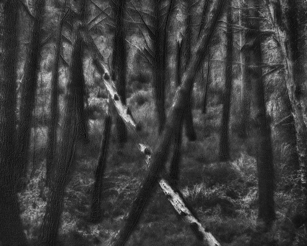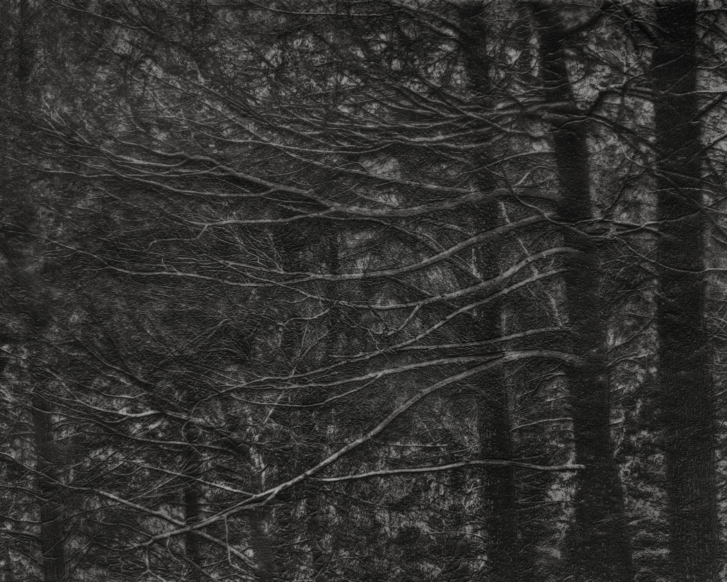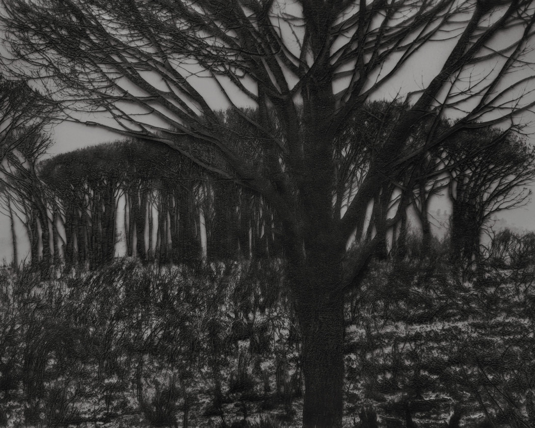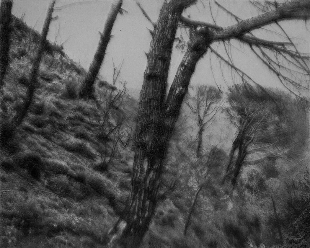 .BLANK rassemble des photographies de forêts incendiées, témoignant du processus implacable de destruction, mais aussi de la capacité du vivant à se régénérer. Réalisées en noir et blanc à la chambre photographique, les images montrent les vestiges de la forêt sicilienne après les grands incendies de l’été 2023. Les tirages ont été obtenus grâce à une technique de gravure laser sans chimie sur carton recyclé : la lente progression du faisceau - vingt-quatre heures de brûlure contrôlée - fait écho à celle du feu dévastateur, tout en créant une surface tridimensionnelle proche du bas-relief. Ces œuvres incarnent la mémoire des paysages calcinés : troncs noircis, ciels embrumés sans horizon, surfaces charbonneuses, mais aussi le frémissement d’un renouveau possible. La matérialité même de l’image - entre brûlure, relief et vibration - traduit ce moment fragile où la forêt détruite commence à renaître de ses cendres.
