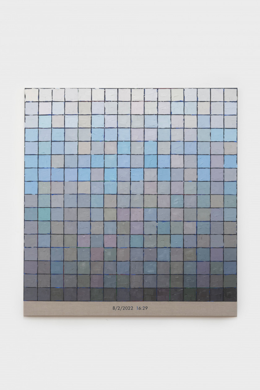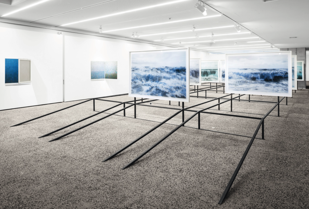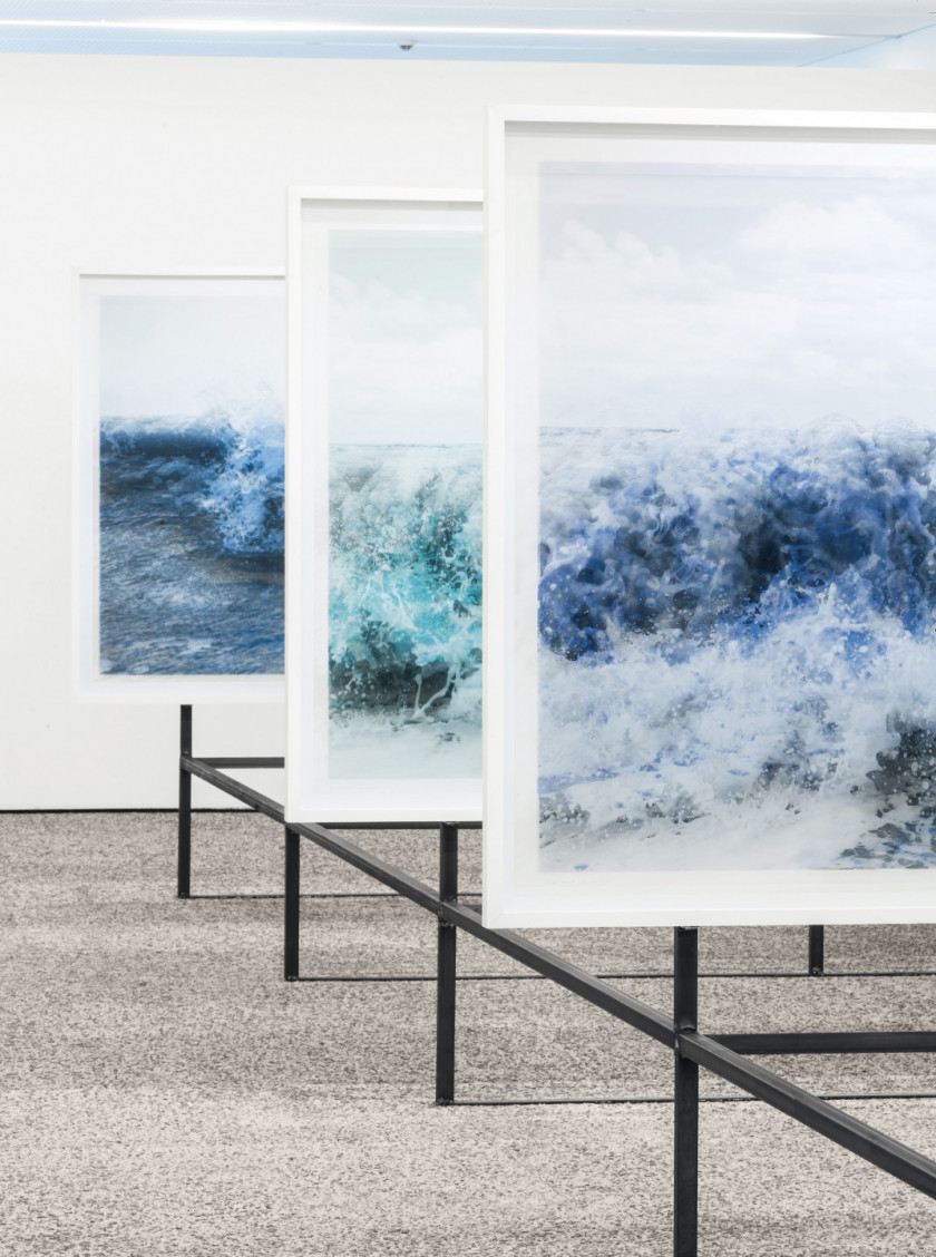 Chaque photographie de la série “Blueprint” (2024) de Stijn Cole combine deux images de la même vague, séparées par une fraction de seconde. La première image est imprimée en monochrome bleu au dos du cadre et la seconde, imprimée en noir et blanc sur le plexiglas, flotte quelques centimètres devant elle. Dans cette perception stratifiée de la force expressive des vagues, la position du spectateur détermine la composition de l’œuvre grâce au faible espace qui sépare les deux images. Pour cette installation, Cole a photographié la mer de part et d’autre des côtes belges et britanniques. Les lieux sont montrés dos à dos, illustrant la géographie des deux points de vue. Sur chaque côte, l’artiste a également pris une photographie comme points de départ de deux peintures abstraites. Ces Colorscapes représentent la palette de couleurs d’un moment déconstruit en 256 teintes et incarnent ainsi la clarté et l’obscurité.