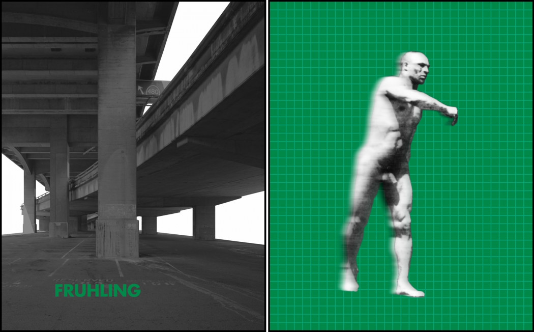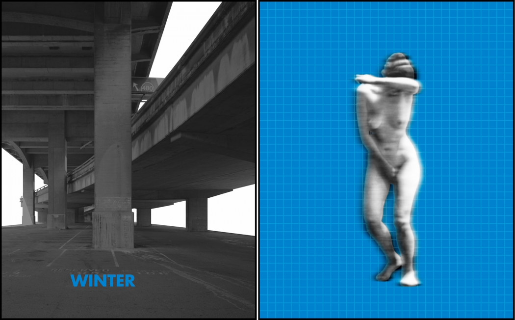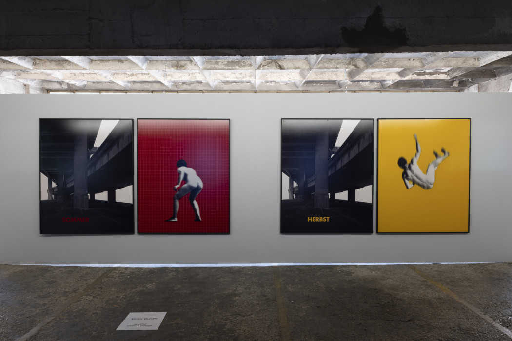 “The Four Seasons” fait désormais référence aux débuts de l’histoire de la photographie en citant des figures tirées des études d’Eadweard Muybridge sur le mouvement humain. Burgin fait également référence à un cycle de dessins en sépia des quatre saisons réalisés par Caspar David Friedrich en 1826, ce qui explique que les noms des saisons apparaissent en allemand.